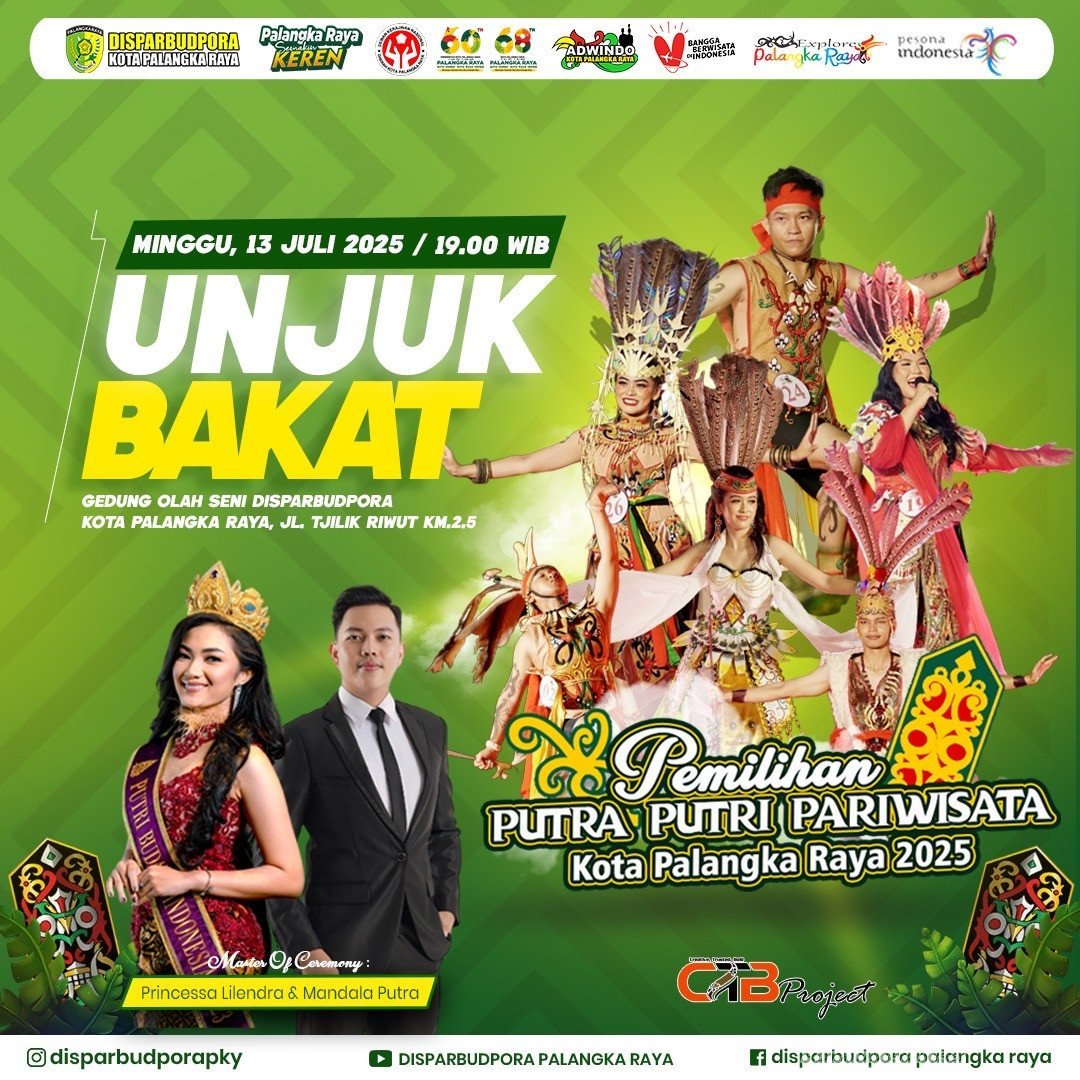 Palangka Raya,- Rangkaian kegiatan Pemilihan Putra Putri Pariwisata Kota Palangka Raya 2025 memasuki babak penuh kreativitas dan semangat budaya melalui Malam Unjuk Bakat yang diselenggarakan di Gedung Olah Seni DISPARBUDPORA, Jalan Tjilik Riwut KM 2,5. Acara yang digelar pada Minggu 13 Juli 2025 pukul 19.00 WIB ini menjadi salah satu ajang penilaian penting dalam menyeleksi duta wisata terbaik yang akan mewakili Kota Palangka Raya di tingkat lebih tinggi.